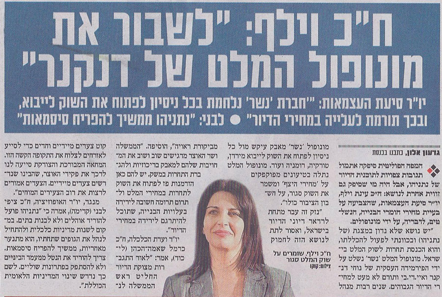 בתקשורת, נושאים נוספים לשבור את מונופול המלט להוזלת מחירי הדיור יולי 27, 2011 כתבה שפורסמה בעיתון "ישראל היום" בתאריך 27 ביולי 2011 בעקבות הדיונים על פתרונות למשבר הדיור