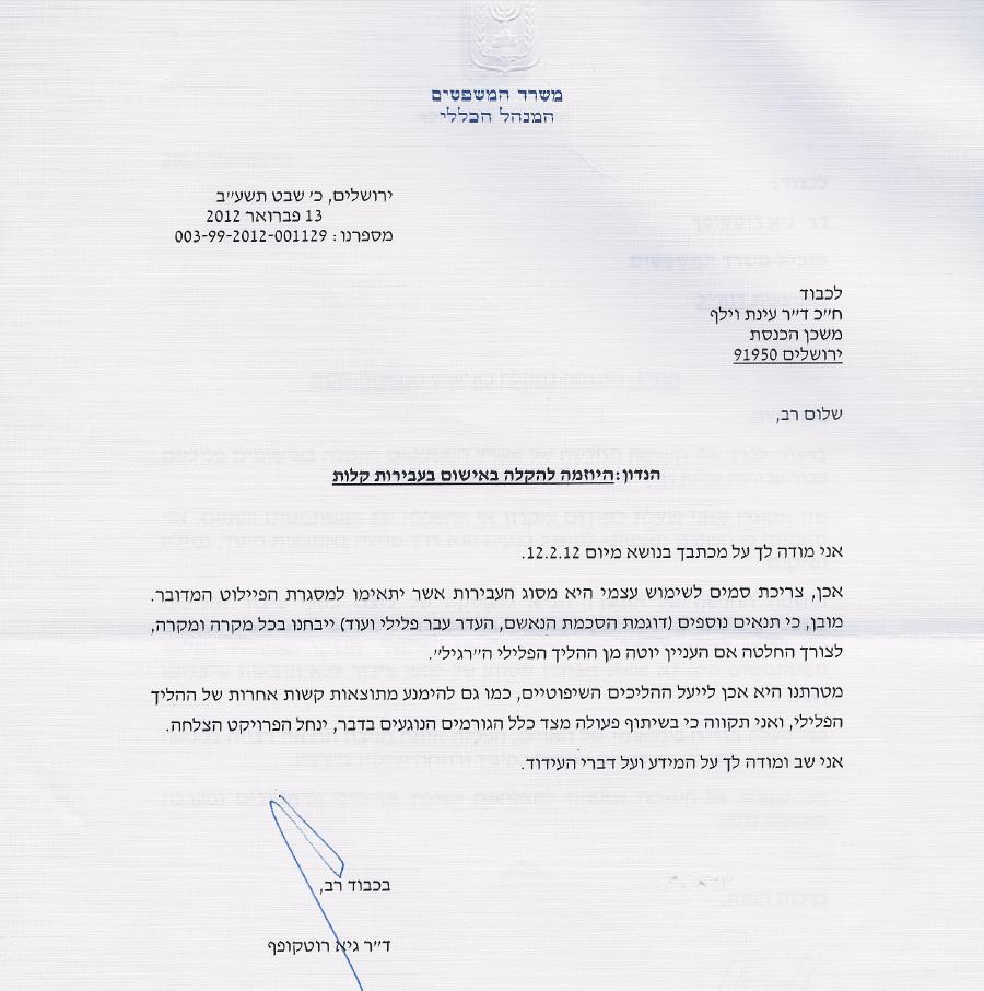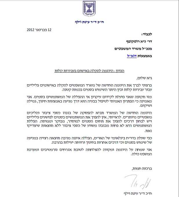 דה קרמיניליזציה של סמים קלים מברכת על יוזמת משרד המשפטים להקלה באישום בעבירות קלות פברואר 13, 2012 ח"כ ד"ר עינת וילף שלחה מכתב למנכ"ל משרד המשפטים, ד"ר גיא רוטקופף, במסגרתו בירכה את המשרד על היוזמה החדשה להקלה באישומים פליליים עבור עבירות קלות ובין היתר השימוש בסמים בכמות קטנה. תשובת משרד המשפטים:
